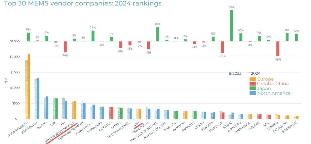 根据Yole发布的意法半导体、恩智浦半导体分别位列第6和第13。恩智浦半导体是领先的汽车MEMS惯性传感器和压力传感器供应商,长期以来一直受到客户的广泛认可。该产品线将完美契合意法半导体的产品组合、制造布局和战略路线的MEMS厂商